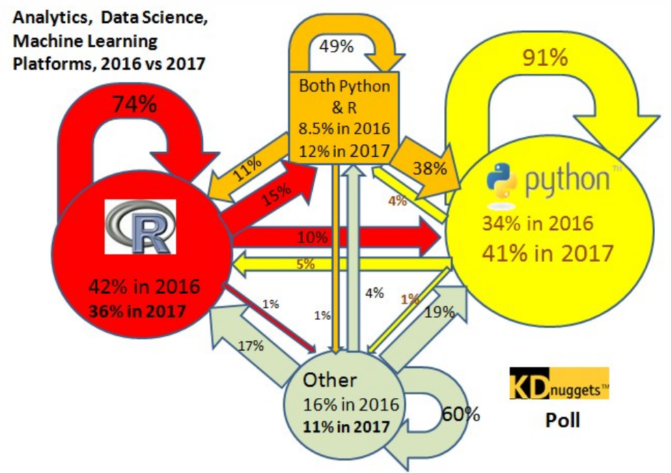 However, with all of these advantages, Python is beginning to raise in popularity, looking to overtake R. As seen in the diagram below, more people are switching over to Python than ever before.